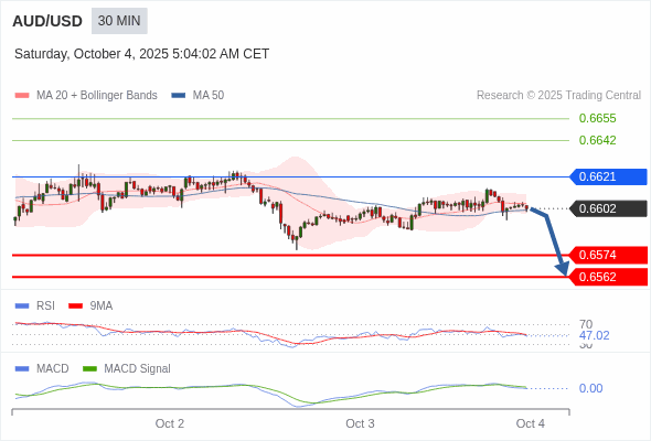 澳元/美元 当日内 : 逐渐下跌,当 0.6621 阻碍上行,则 0.6562 为目标位。