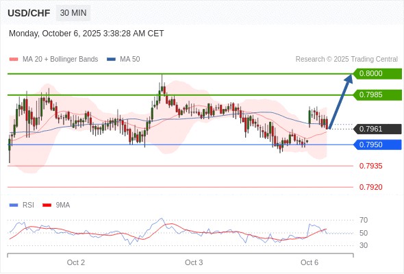在 0.7950 之上,看涨,目标价位为 0.7985 ,然后为 0.8000 。