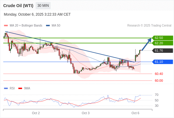 在 61.10 之上,看涨,目标价位为 62.20 ,然后为 62.50 。