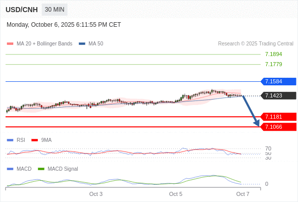 备选策略: 向上突破 7.1584 ,将带来继续上行的趋势,目标位定在 7.1779 和 7.1894 。