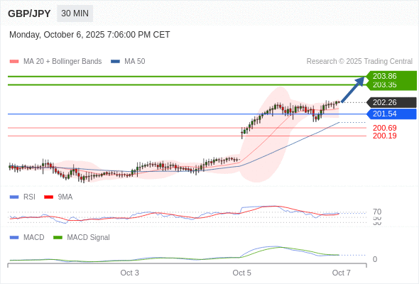 英镑/日元 当日内: 看涨,当 201.54 为支撑位,目标定在203.86。