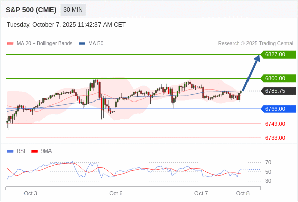 美国标普500指数期货 (Z5) 当日内: 在6766.00之上,看涨。