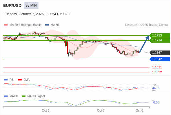 欧元/美元 当日内 : 有上涨的可能,目标价位定在 1.1733 。