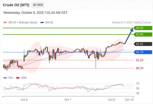 在 61.70 之上,看涨,目标价位为 62.80 ,然后为 63.20 。