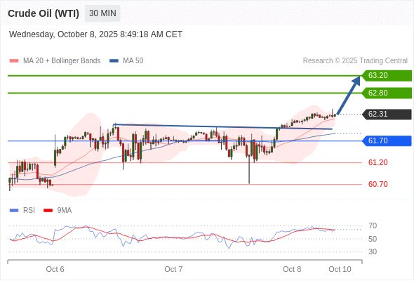 在 61.70 之上,看涨,目标价位为 62.80 ,然后为 63.20 。