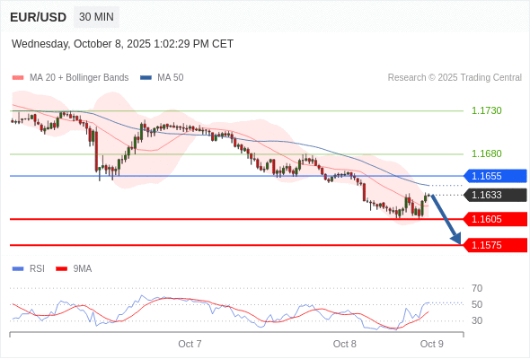 在 1.1655 之下,看跌,目标价位为 1.1605 ,然后为 1.1575 。