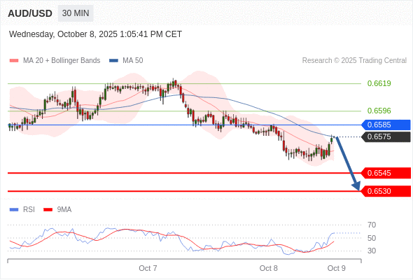 在 0.6585 之下,看跌,目标价位为 0.6545 ,然后为 0.6530 。