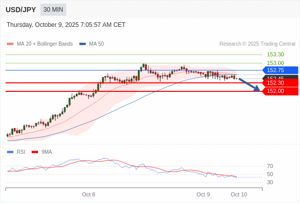 在 152.75 之下,看跌,目标价位为 152.30 ,然后为 152.00 。