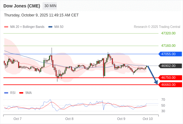 在 47055.00 之下,看跌,目标价位为 46750.00 ,然后为 46660.00 。