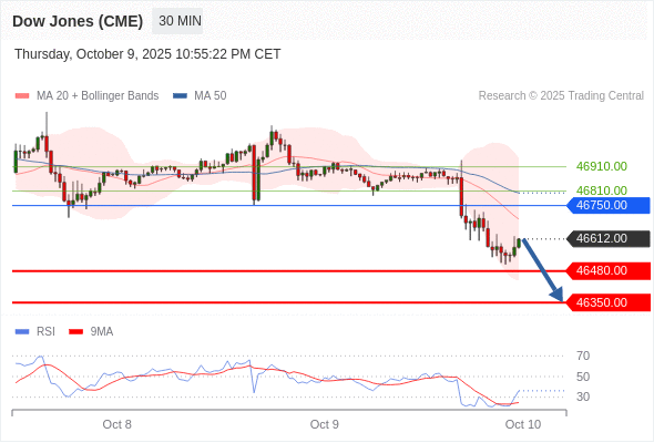 在 46750.00 之下,看跌,目标价位为 46480.00 ,然后为 46350.00 。