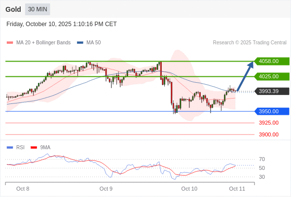在 3950.00 之上,看涨,目标价位为 4025.00 ,然后为 4058.00 。