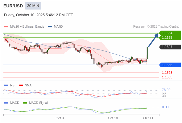 技术点评: RSI技术指标大于70。在这种情况下,说明有很强的上升趋势,或者意味着处在超买的状态下,可能会有向下的调整。我们将观察RSI技术指标是否出现背离现象。 MACD技术指标处在其信号线之上看多。 配置为正。 此外,价位高于其20天及50天移动平均线 ( 分别位于1.1575 和1.1569 )。 最后,价位突破其布林线通道上轨 (位于1.1602。