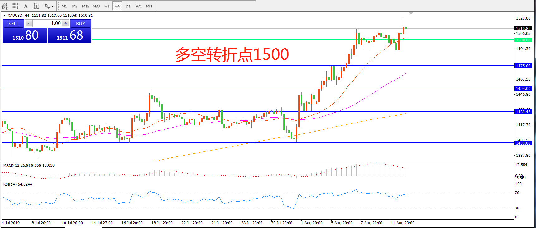 贸易争端加剧了对全球经济增长和汇率波动的担忧,美国股市大幅下滑,引发了市场避险情绪,而随着市场避险情绪升温,现货黄金短线拉升13美元,刷新日高至1519.29美元/盎司,较盘中低点拉升逾30美元,最终收报1510.20美元/盎司。贸易前景的不确定性、全球经济放缓、股市回落,全球央行降息等因素,依然为金价提供明显支撑。