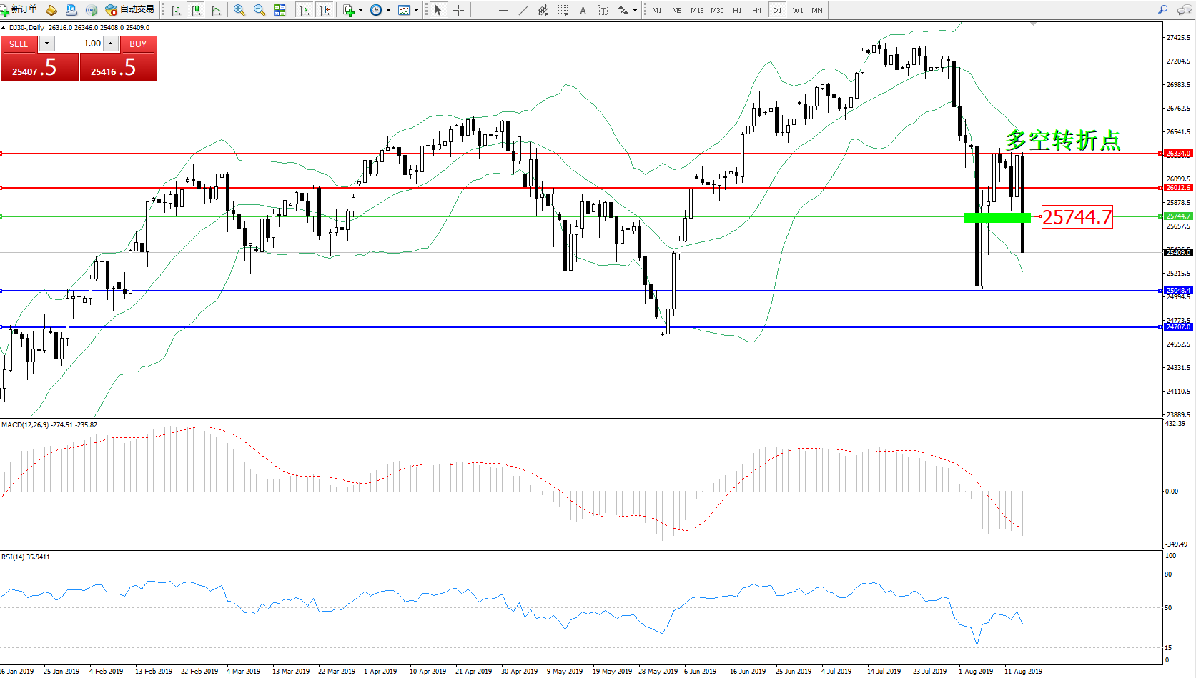 道琼斯指数814日(周三)收盘下跌800.50点,跌幅3.05%,报25479.42点。前美联储主席耶伦:历史上来看,国债收益率曲线倒挂或不是经济衰退的适宜指标,触发美债收益率跌向零的因素,即衰退风险,比预期来得要早,而且可能加快美国加入日本和德国等负收益率俱乐部的进程。导致企业减少或推迟支出、进而使全球资本支出下降的贸易摩擦是催化因素。美联储防止美国经济陷入衰退的力量可能会减弱,到202110年期美债收益率可能下跌至零。这比上月预测提早了一年。触发因素提早发生了,债券市场正在更快地做出行动。