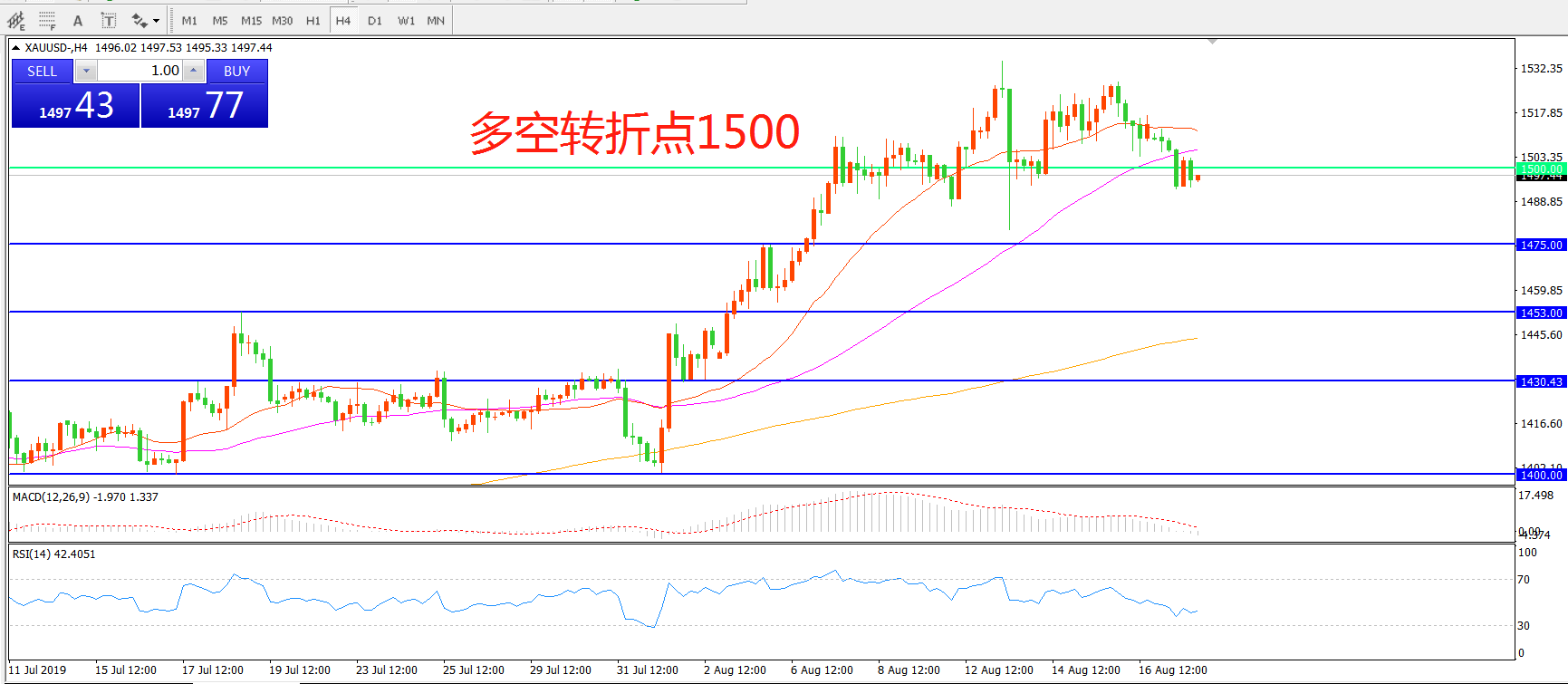 美联储票委、波士顿联储主席罗森格伦周一表示,对7月的利率决议有异议是因为经济表现相当好,如果没有行动的必要,放松政策是有成本的。美国消费强劲,支出可以支撑经济,美元震荡走高,打压金价,现货黄金一度跌逾20美元,千五关口被跌破,收报1497.06美元/盎司,获利了结影响了黄金的表现,但中期走势依然偏多。