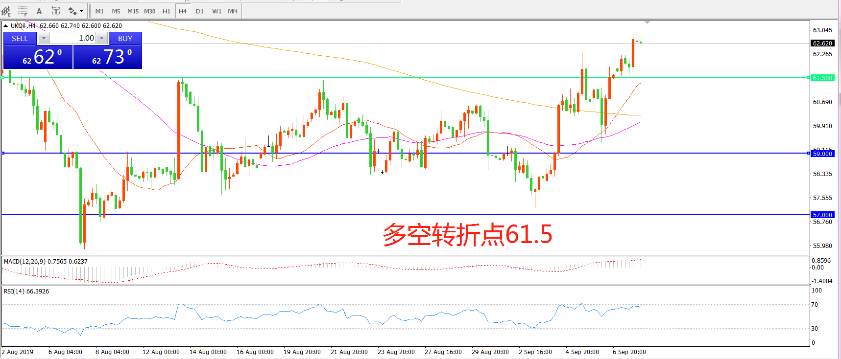 4小时图看,油价长阳拉升,突破前期阻力,整体表现十分强势,MACD红柱增加,RSI指标走平,日内延续上行概率较大。