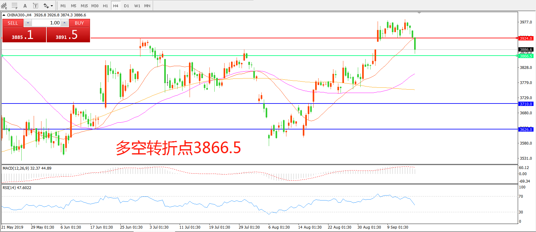 4小时图看,沪深300上阴下破,回补前期缺口,整体走势走弱,但均线系统依然呈多头排列,MACD红柱减少,RSI指标向下,日内依然有回落风险,但中期走势依然偏多。