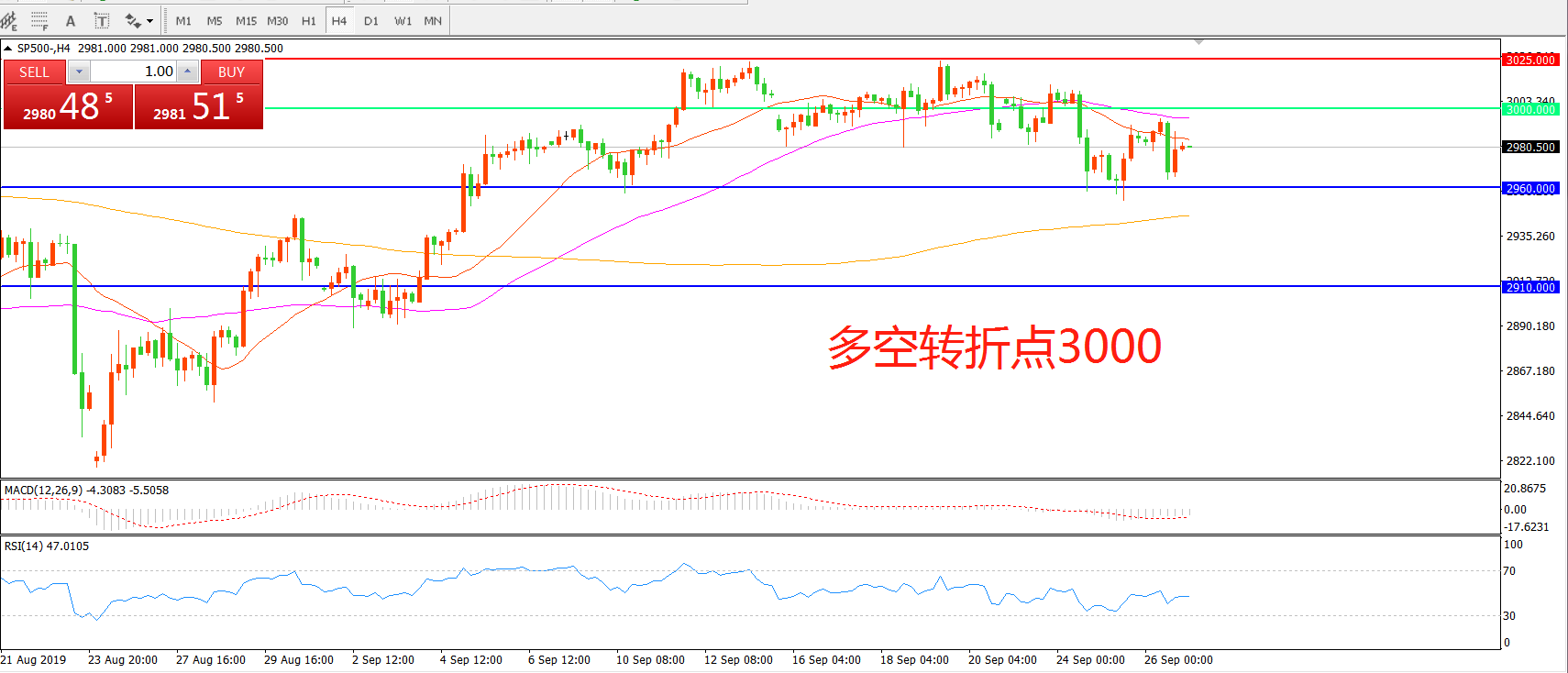 4小时图看,标普500触碰2960支撑后震荡出现反弹,目前维持宽幅震荡走势,均线系统走平,MACD红柱减少,RSI指标拐头向上,日内延续震荡概率较大。