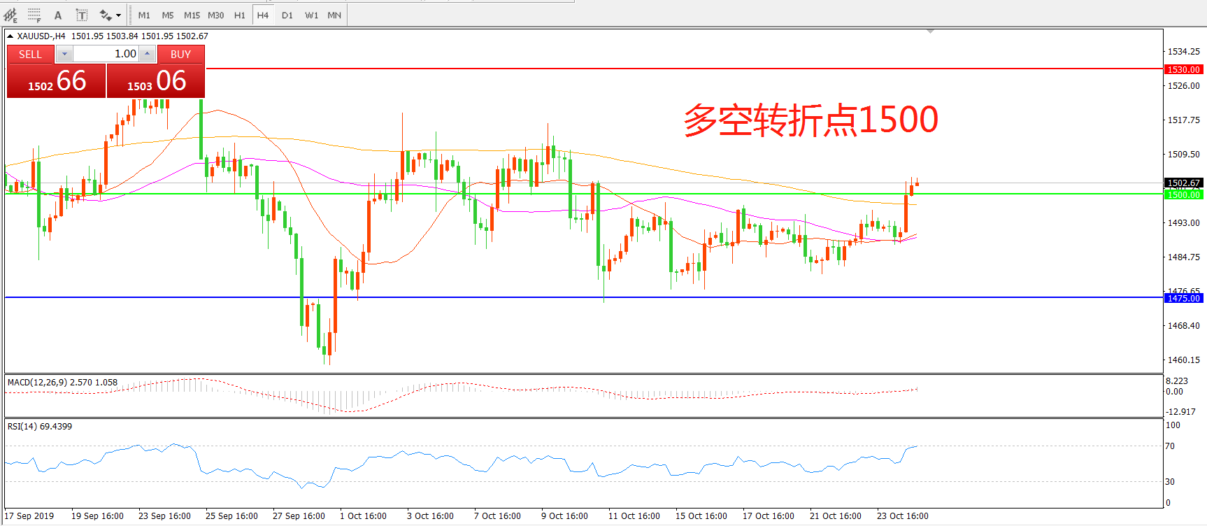4小时图看,金价低位震荡后,阳线强势反弹,突破1500阻力后继续上行,整体表现有所回暖,均线走平,MACD红柱增加,RSI指标向上,日内震荡上行仍是大概率事件。