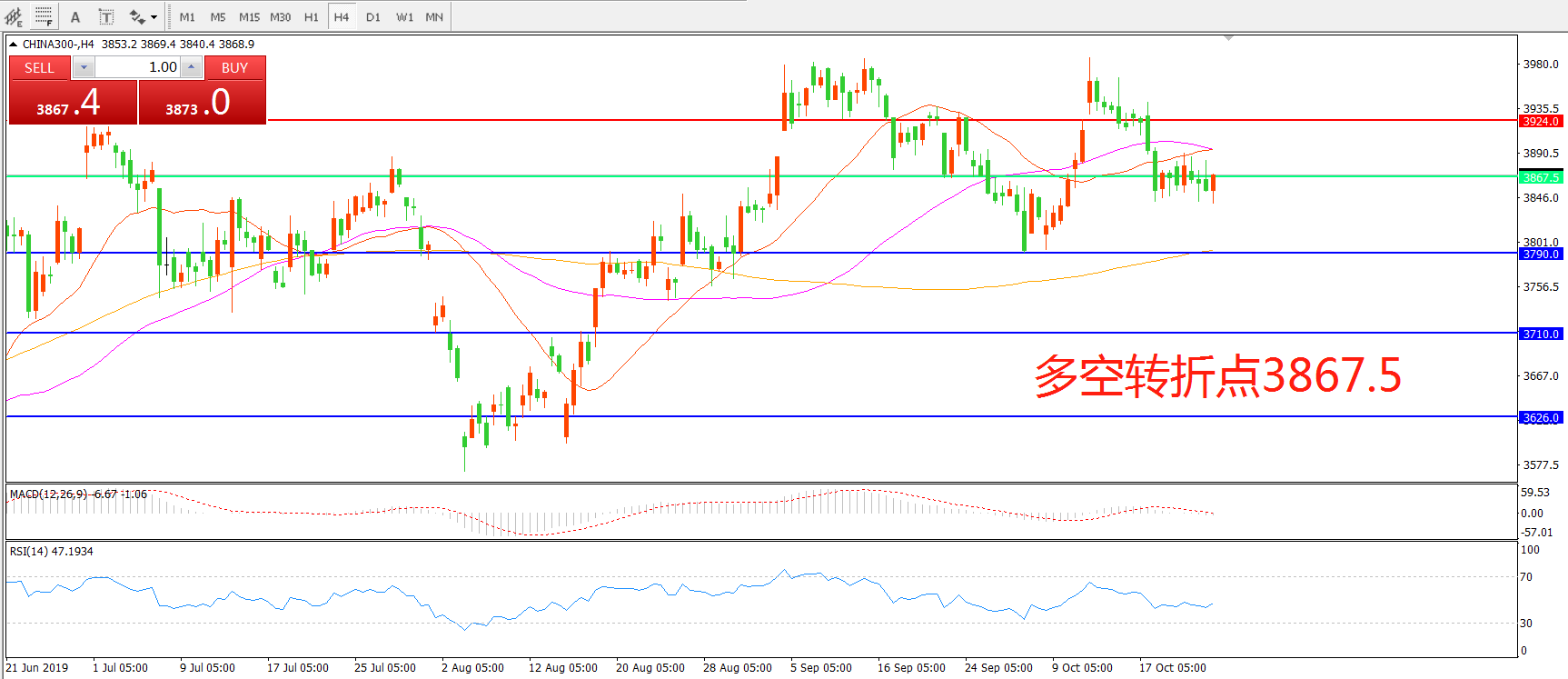 4小时图看,沪深300围绕3867.5附近窄幅整理,整体走势有止跌迹象,3980、3924成为上方明显阻力,均线系统走平,MACD红柱缩短,RSI指标向下,日内延续震荡概率较大。