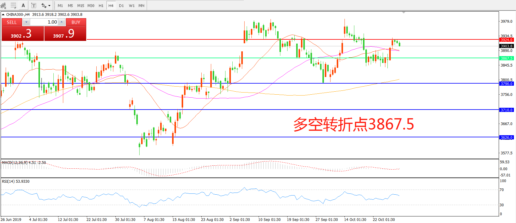 4小时图看,沪深300触碰3924阻力后震荡回落,显示上方阻力较强,但整体依然处于均线支撑之上,MACD红柱缩短,RSI指标向平,日内震荡上行较大。