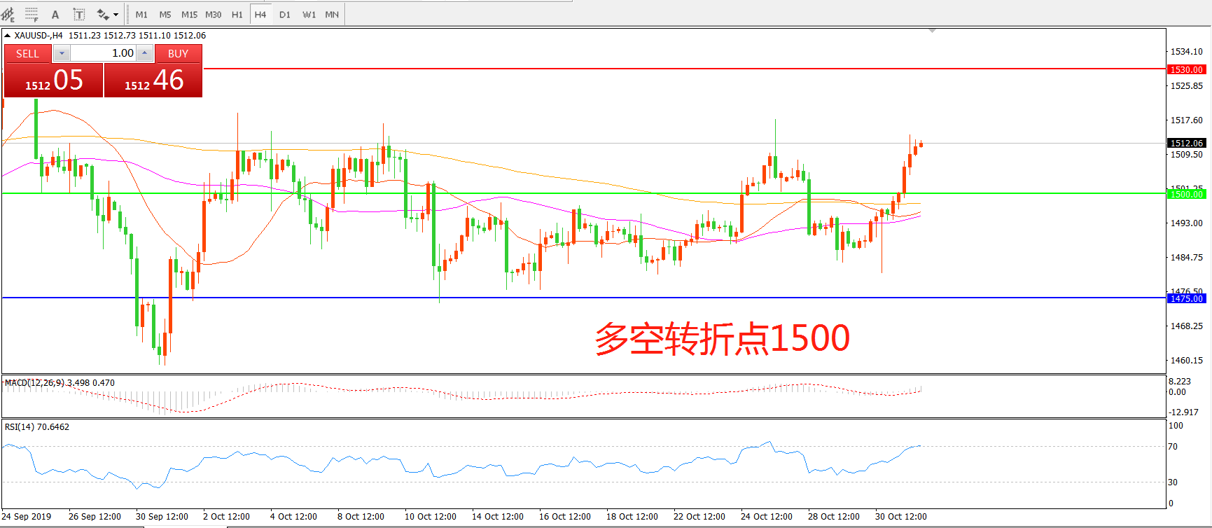 周四(10月31日,美国众议院投票,通过对特朗普的弹劾调查程序,美国众议长佩洛西宣布决议通过。由于智利取消APEC会议,原定于在会议上由中美双方首脑签署的协议有可能会受到影响。市场避险情绪爆发,金价扶摇直上,突破千五大关,收报1512.10美元/盎司。昨日公布的美国9月PCE物价指数年率表现不及预期,重点关注晚间非农数据表现。