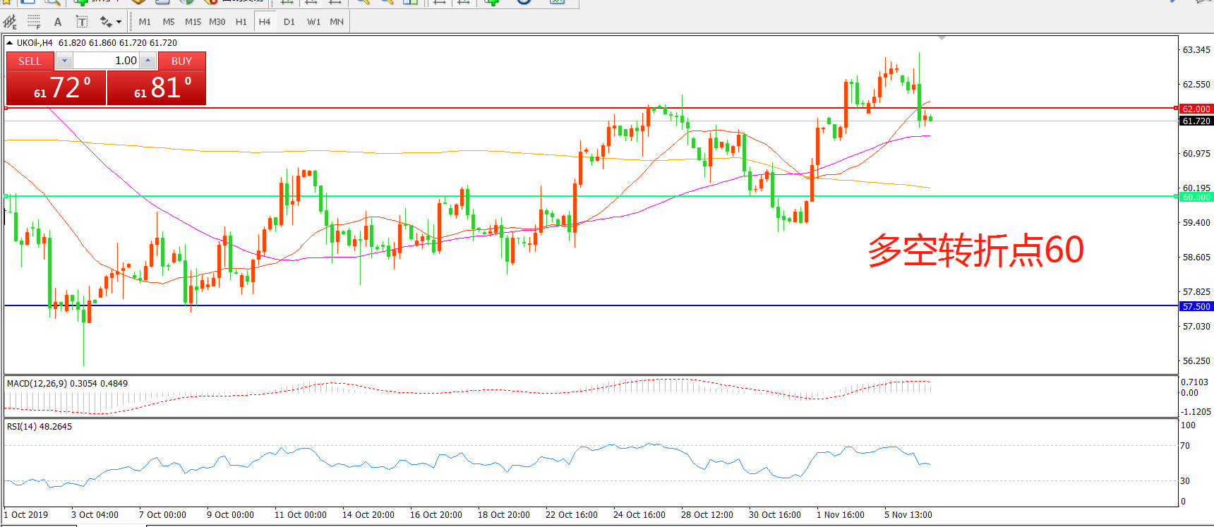 4小时图看,油价触碰62美金阻力后震荡回落,但依然处于上行趋势之中,均线系统拐头向上,MACD红柱减少,RSI指标走平,日内油价延续上行概率较大。