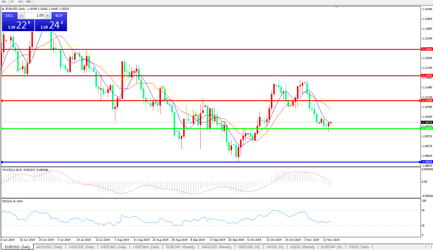 欧元兑美元在周四延续隔夜颓势,承压于1.10关口上下,因日内全球风险情绪进一步因为亚太地区的低迷经济数据趋于恶化,投资者同时对于欧元区的经济表现也仍不看好,并因而继续押注欧洲央行有进一步宽松预期。 虽然,日内发布的德国GDP数据显示该国经济在三季度意外录得0.1%的环比增长,连续两个季度负增长从而陷入技术性衰退,但该数据却未能引领欧元汇价走出泥潭。因为虽然德国经济避免衰退,但是其增长低迷的格局却并未有实质性变化。因此,对欧洲央行强化宽松的预期仍旧存在; 此外,隔夜美联储主席鲍威尔也再度宣称美国经济面临“外部风险”,欧元区经济低迷状况显然无法为各界所忽略。虽然评级机构穆迪试图给市场打强心针,宣称未来两年全球经济没有衰退风险。但与德国GDP数据一样,如此“利好”程度尚不足以把欧元汇价带出当前的下行轨道。