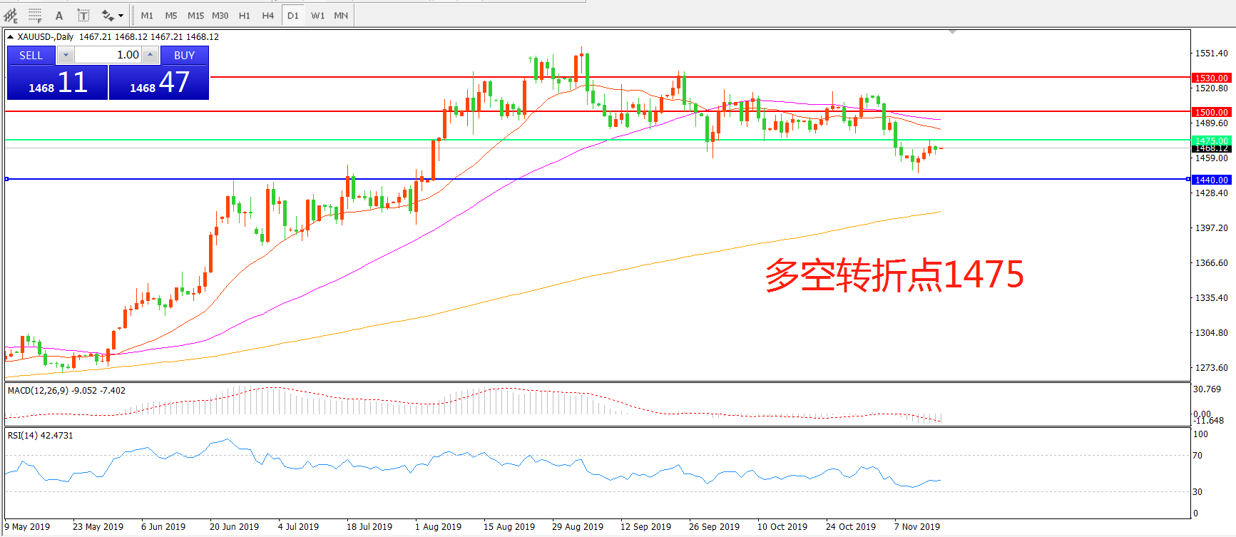 上周,因美国股市触及纪录高位,国际贸易谈判取得进展,风险情绪偏向乐观,避险情绪受到打压。此外各国央行宽松步伐放缓、美联储官员的鹰派表态让金价雪上加霜,现货黄金大幅下跌,最终收报1467.91美元/盎司。但技术面上有企稳的迹象,1440成为短线支撑,1475成为上方阻力,日内重点关注这一区域的得失。