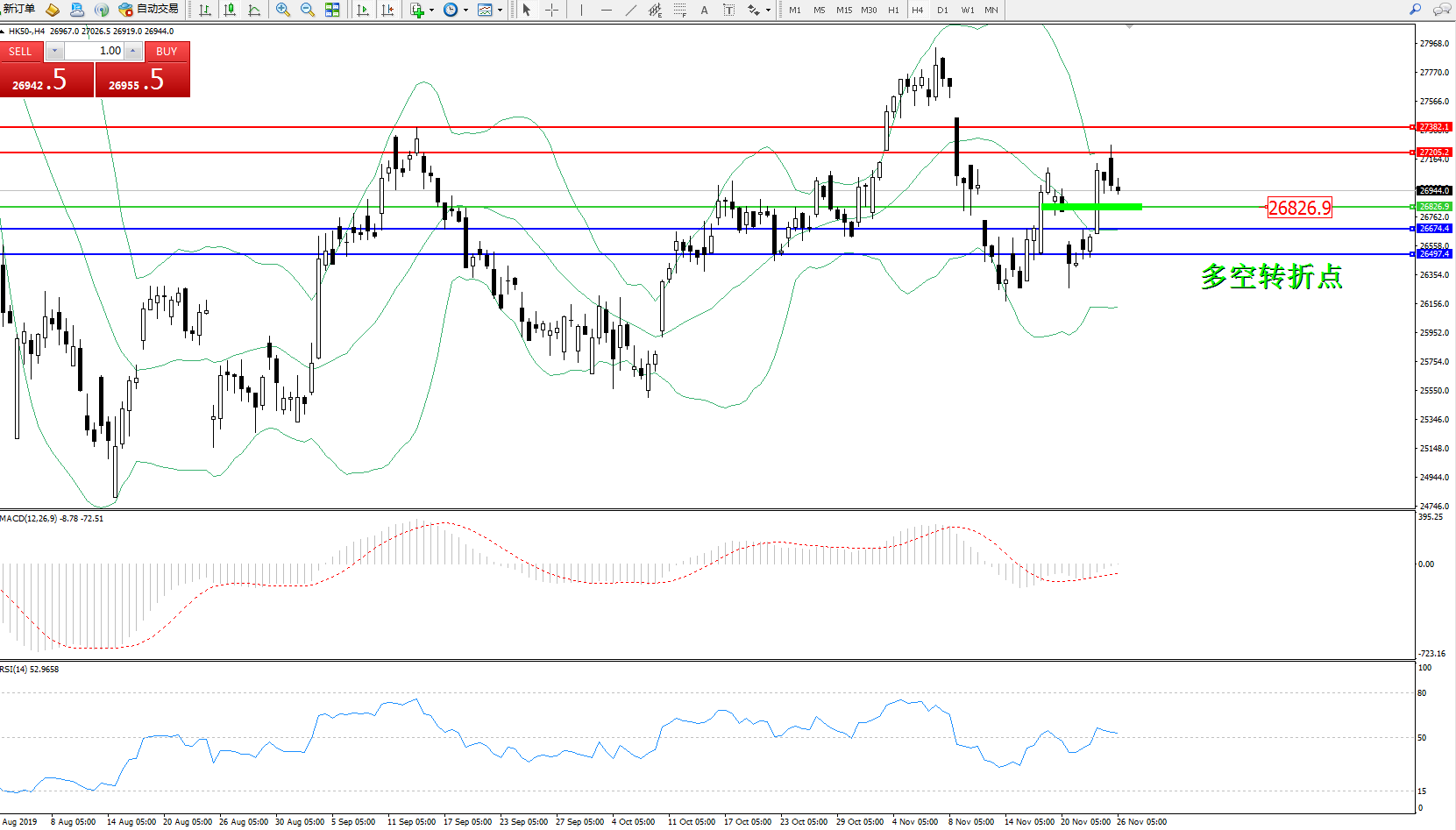 香港恒生指数11月26日(周二)收盘下跌79.12点,跌幅0.29%,报26913.92点;昨晚夜期受惠好消息出台,率先冲上27000关口以上收市。港股早上高开扩大升幅,最高触及27227后继续下挫,当前市场消息面静淡,整固行情在所难免,预计恒指仍会继续调整。阿里巴巴今日登陆港交所,上市首日收涨6.59%,收报187.60港元,总市值超过4万亿港元,超过腾讯,成为新的“港股之王”。