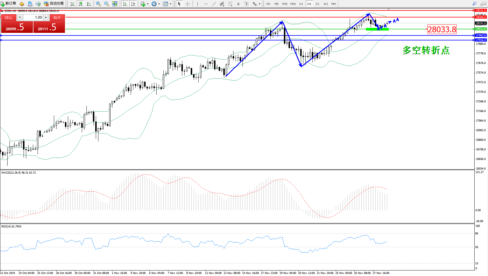 纽约证券交易所周四(11月28日)休市一天,纽约证券交易所提前于北京时间周六(11月30日)2:00休市,道琼斯指数11月27日(周三)收盘上涨42.30点,涨幅0.15%,报28164.00点。美国经济增长第三季略有提速,第三季度GDP的年化增长率为2.1%,好于最初报告的1.9%和上一季度的2%;而不是像最初数据显示的那样放缓。这让市场确信,尽管人们担心旷日持久的贸易争端会带来影响,但全球最大经济体美国经济体质依然稳健。市场信心高涨,美联储短期内不会进一步放松货币政策,美联储主席鲍威尔周一称,货币政策“处于良好位置”,以支持强劲的就业市场。