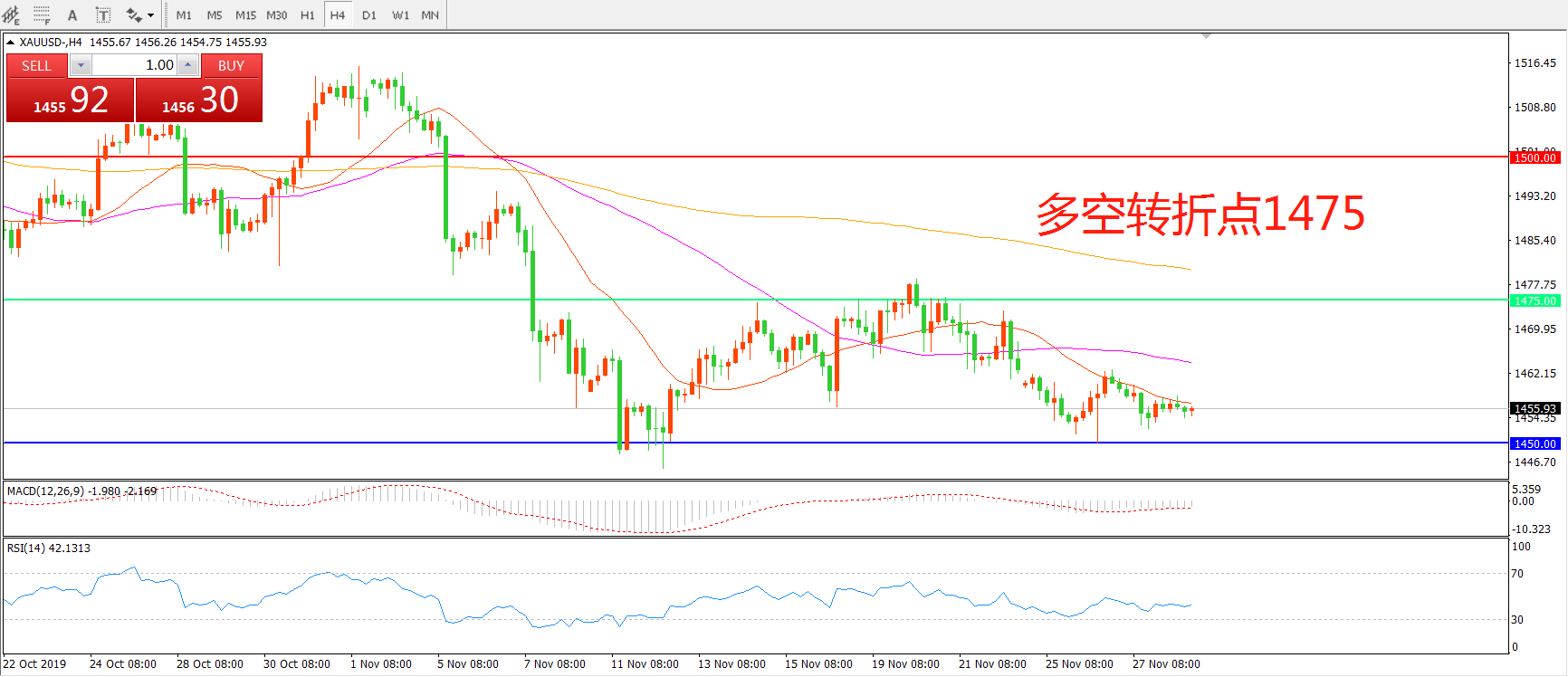 周四(11月28日),由于处于感恩节假期,市场成交清淡,金价维持在4美元左右的波幅区间窄幅波动,在过去的一个月里,由于围绕中美贸易谈判的乐观情绪升温,黄金遭到抛售,一步步跌破关键支撑,目前险守于1450一线。昨日,中国外交部发言人耿爽表示,中国政府和中国人民坚决反对美方将所谓的“香港人权与民主法案”签署成法。中方强烈敦促美方不得实施该法,贸易磋商的变数有可能给金价带来一定支撑。