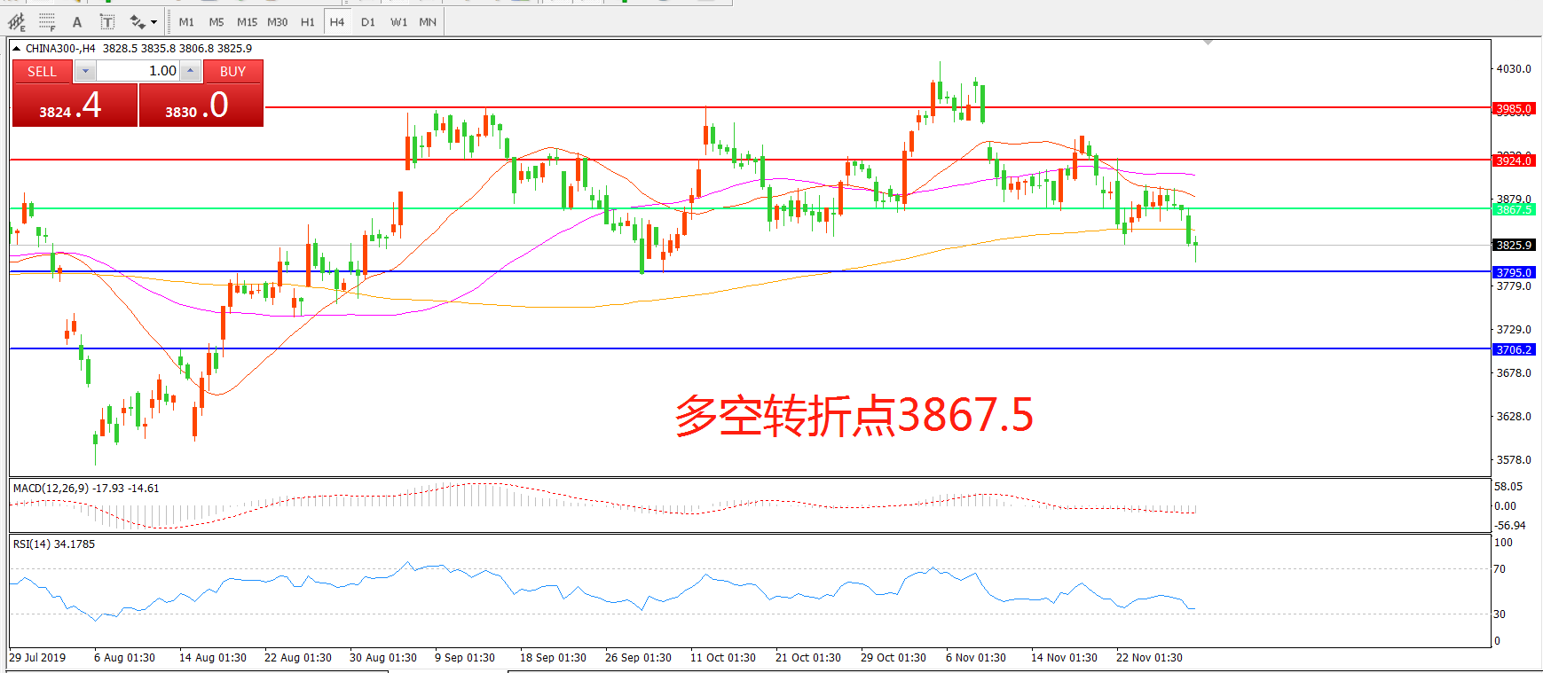 4小时图看,沪深300延续低位震荡,200周期均线被跌破,短期走势偏空中,MACD绿柱增加,RSI指标向下,日内延续下行概率较大。