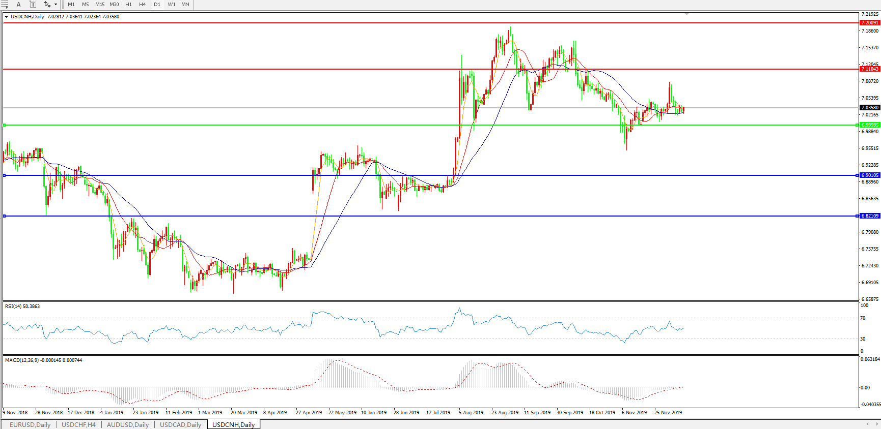 技术面简析:日图均线粘合无明显方向,汇价7.0关口上方开始窄幅波动,MACD自0轴下方逼近0轴且量能收缩几无,RSI震荡无方向,预计短期汇价将在7.0关口附近整理,中期汇价需等待美元指数及中美贸易谈判最新进展指引。