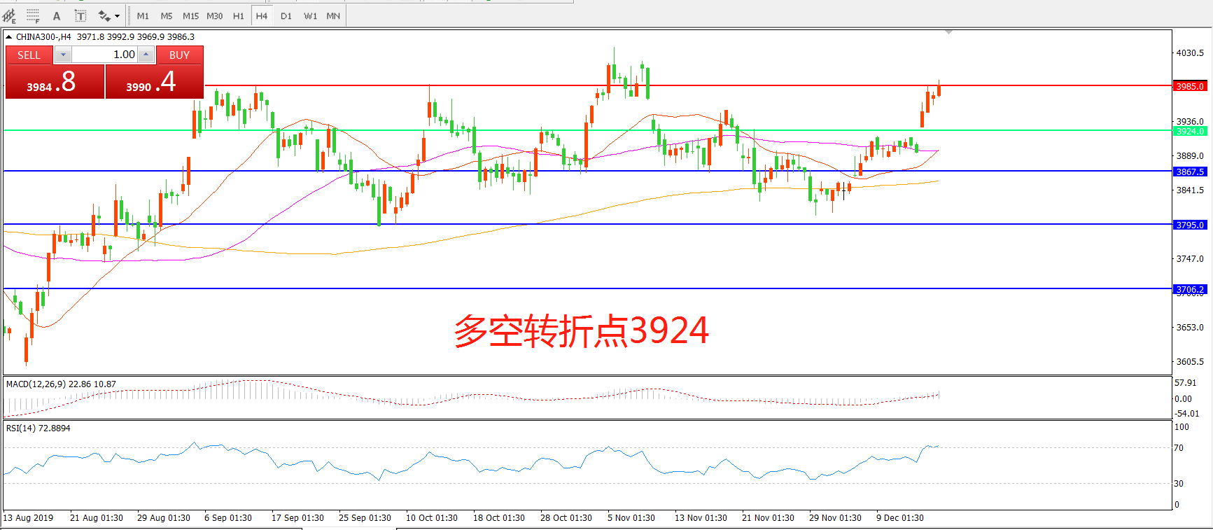 4小时图看,沪深300阳线连续拉升,整体走势偏强,均线系统走平,MACD红柱增加,RSI指标向上,日内延续上行概率较大。
