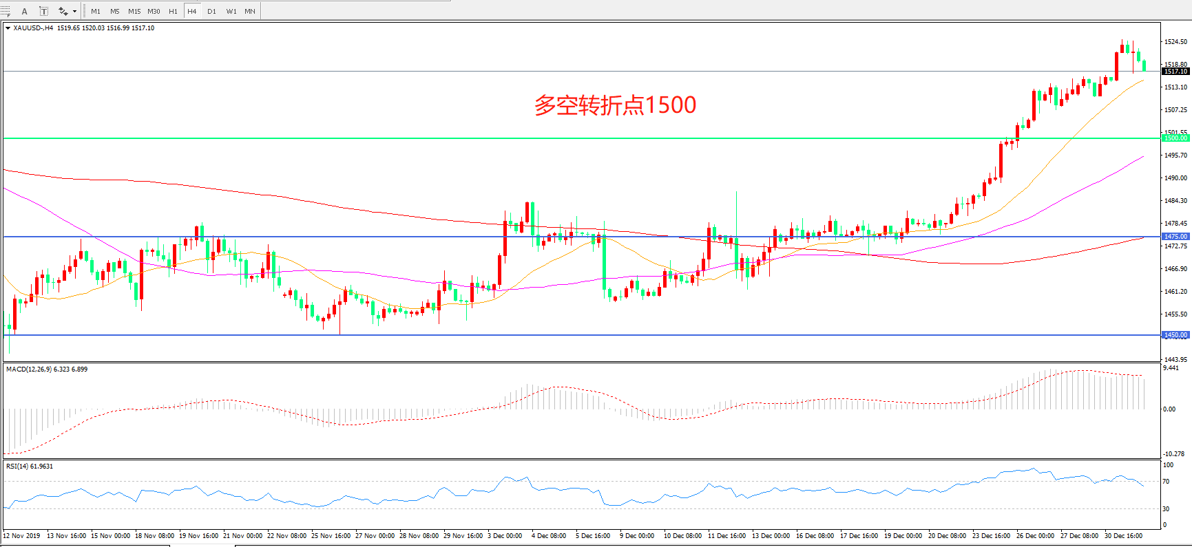 2019年最后一个交易日,金价延续强势表现,收报1517.10美元/盎司,升至近三个月高位,随着全球央行采取宽松货币政策以促进增长,英国脱欧、中东地区的动荡局势,以及主要中央银行和ETF的购买热情也帮助支撑了金价。随着圣诞元旦假日过后,将进入中国的新年,历来该季节都是黄金的最佳表现时机,因此金价的涨势有望延续至中国新年之后。