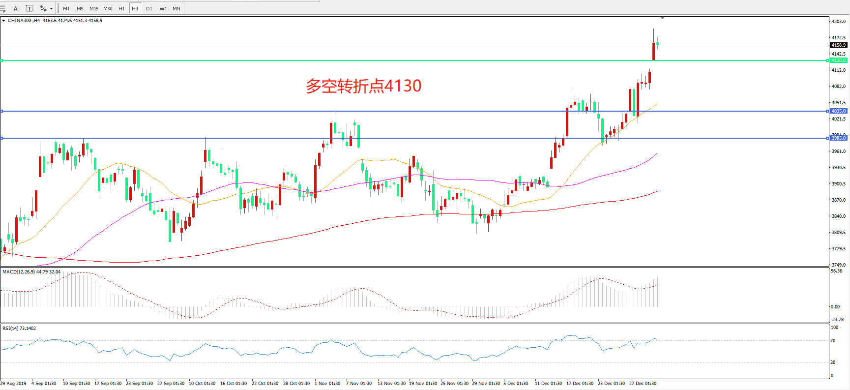 4小时图看,沪深300高开高走,一句突破4130阻力,整体表现十分强势,均线系统呈多头排列,MACD红柱增加,RSI指标向上,日内延续上行概率较大。
