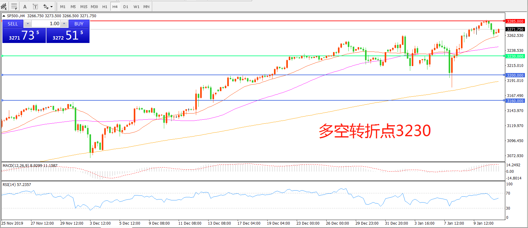 4小时图看,标普500触碰上方阻力小幅回落,但整体依然处于多头形态,均线系统呈多头排列,MACD红柱减少,RSI指标向上,日内延续上行概率较大。