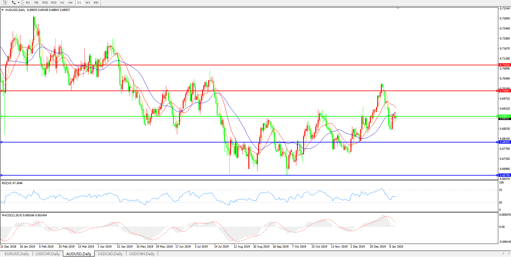 澳元兑美元在周一欧洲时段盘中再度录得下跌,抹去了日内早间的涨幅。此前,受美国12月非农就业数据表现不及预期,以及中美一阶段贸易协议签署在即的推动,澳元兑美元曾录得相当幅度反弹。然而,这却无法盖过投资者对基本面情势的忧虑;一方面,澳洲持续多时的空前森林大火已经引发了该国的生态灾难,并危及其农牧矿业生产活动,另一方面,澳洲经济数据整体表现本也已经持续疲软,这都令澳洲联储在2月份的下次会议上进一步降息的概率持续升温,目前已经超过50%。这也将令澳洲联储全年宽松力度预期明显超过美联储,并因而持续利空澳元;受此状况影响,若澳元兑美元日内无法收于0.69关口上方,后市仍面临跌向上周低位0.6850风险,而这将打开更大的下跌空间,尤其是在中国贸易签约后触发“卖事实”行情的状况下。