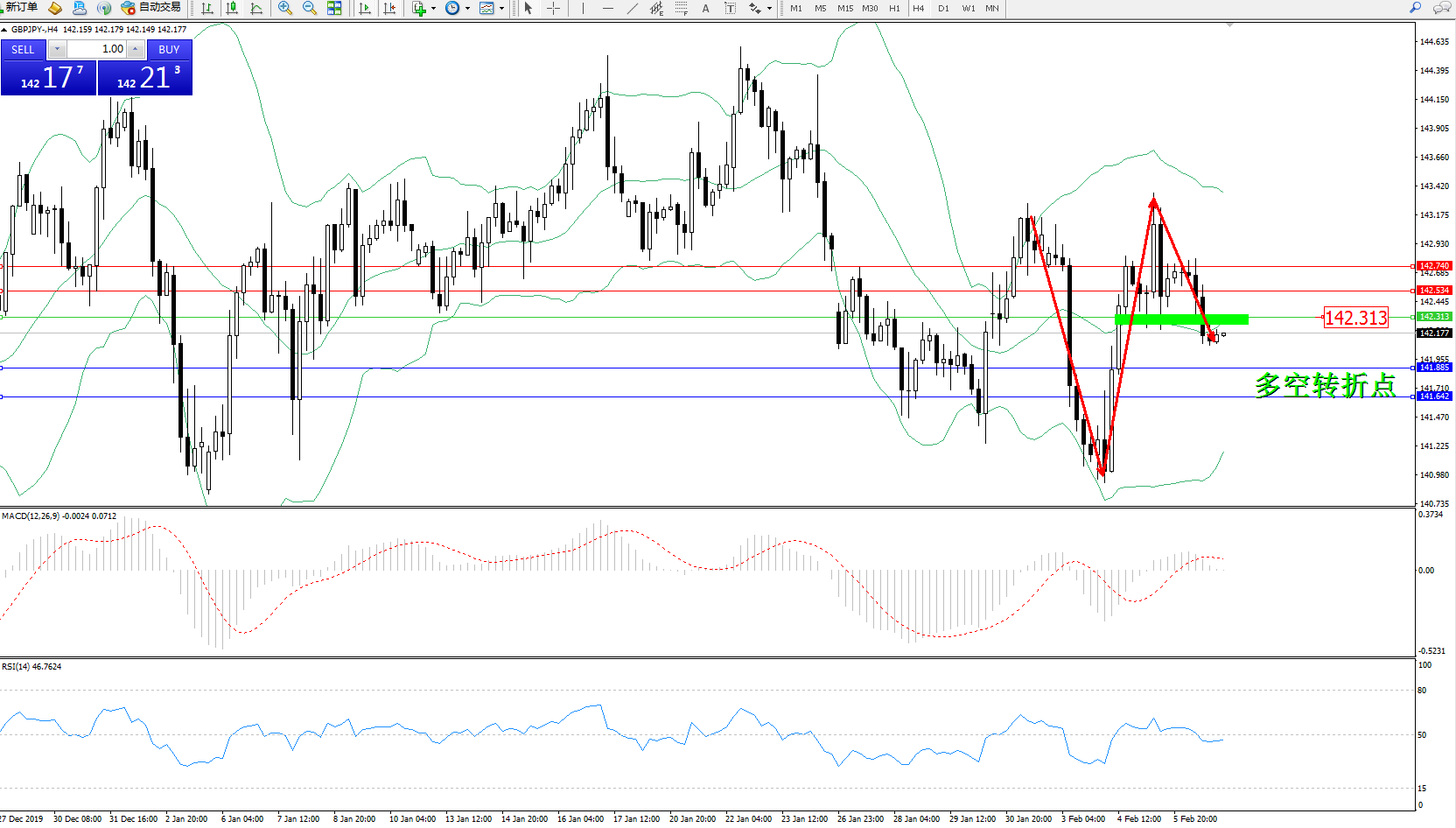 交易策略:142.313下方看跌,目标141.885、141.642