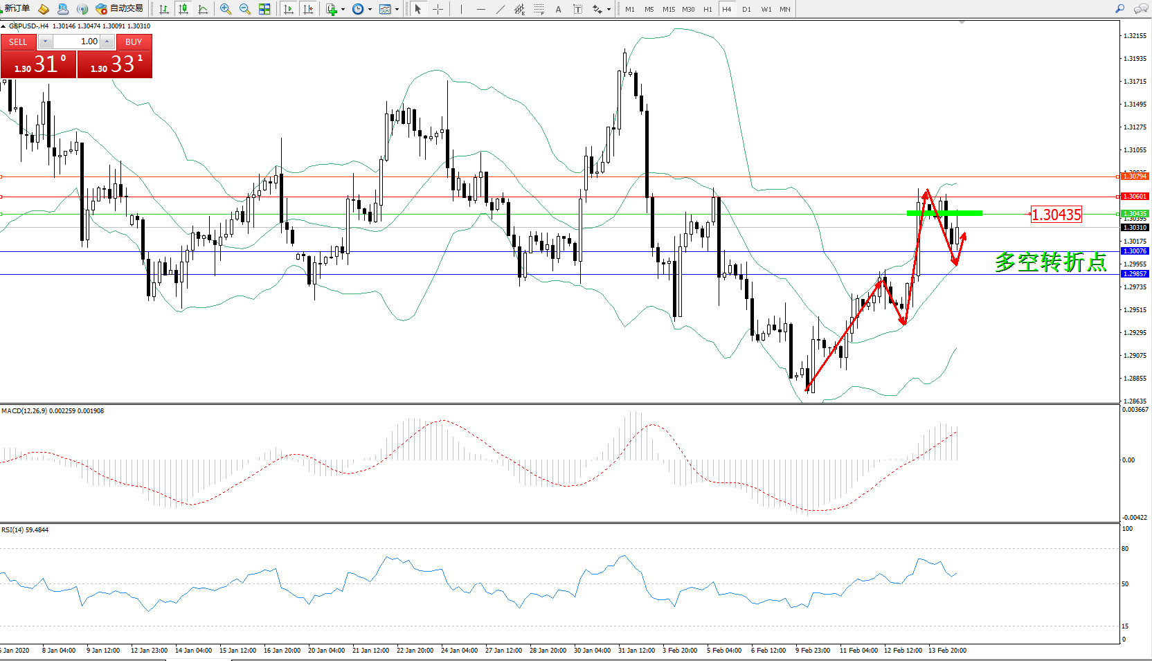 交易策略:1.30435下方看跌,目标1.30076、1.29857