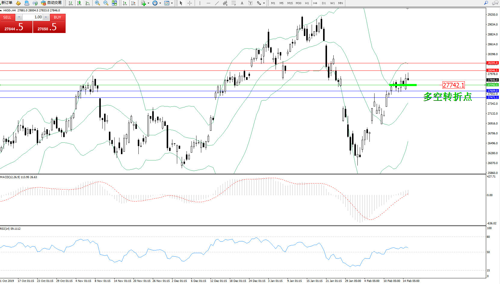 恒指HK50 ——4小时K线图显示: