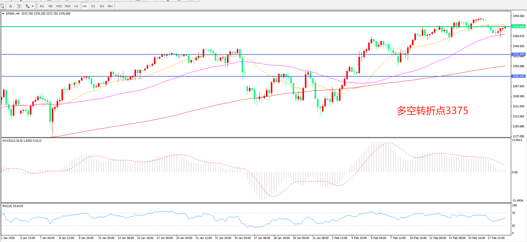 4小时图看,标普500呈现高位震荡形态,小幅回落,均线系统呈多头排列,MACD红柱减少,RSI指标走平,日内延续震荡概率较大。