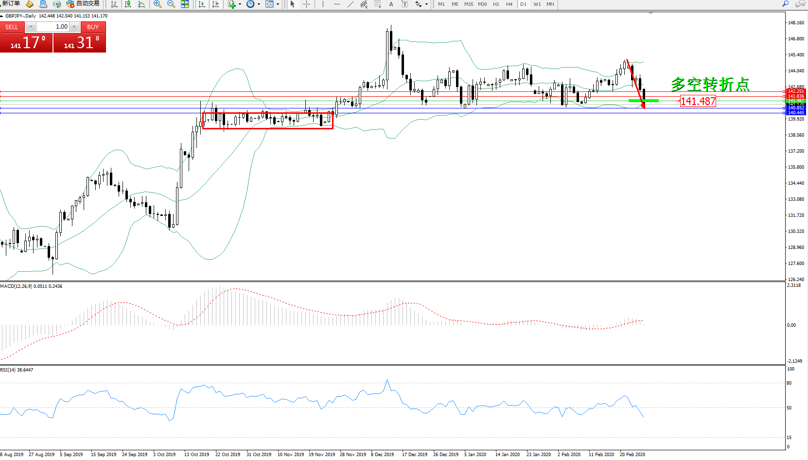 备选策略:141.487上方看涨,目标141.836、142.251