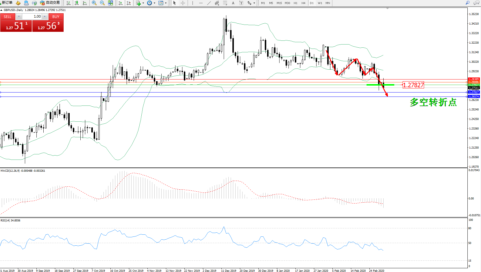 交易策略:1.27827下方看跌,目标1.27027、1.26574