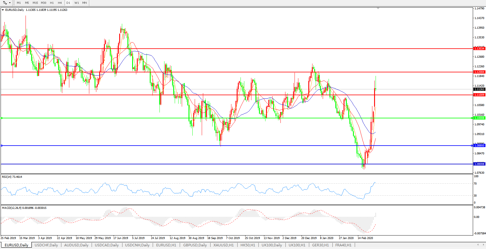 瑞士瑞信银行(Credit Suisse)发布技术分析报告指出,欧元兑美元短线在中期下行通道中料将进一步反弹。汇价的长期走势在1.0778/51寻获强劲支撑,但近期开始反弹,尽管依然处于一个清晰的中期下行通道内,该货币对有望在短线内保持上行。欧元兑美元一度上涨1.4%至1.1185,触及1月7日以来最高;货币对最新报1.1145;随着中央银行承诺在公共卫生事件下采取行动以支持全球经济,杠杆和套利头寸解除,欧元兑美元应声上升。欧洲央行政策制定者,包括拉加德,已经表现出不愿在目前负0.5%的基础上进一步降息。