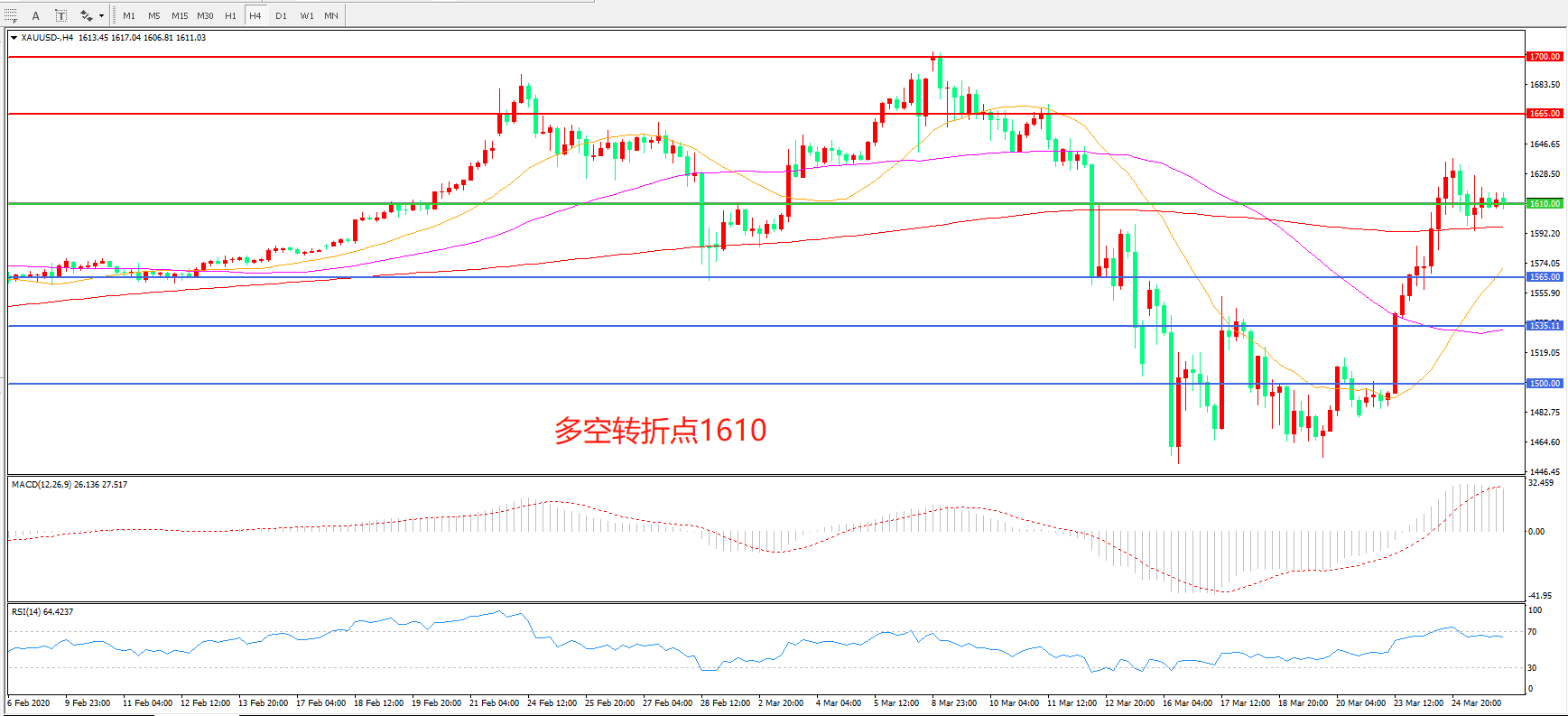 周三(3月25日),在连续暴涨两天后,黄金暂缓了“冲锋”的脚步,现货黄金小幅回落,收报1610美元/盎司,黄金此前两天时间几乎收复八天暴跌的“阵地”,出现短期回调也属正常。美联储无限宽松、扩表降息,通胀担忧将会回升并大概率导致美元贬值,均对黄金形成利好。