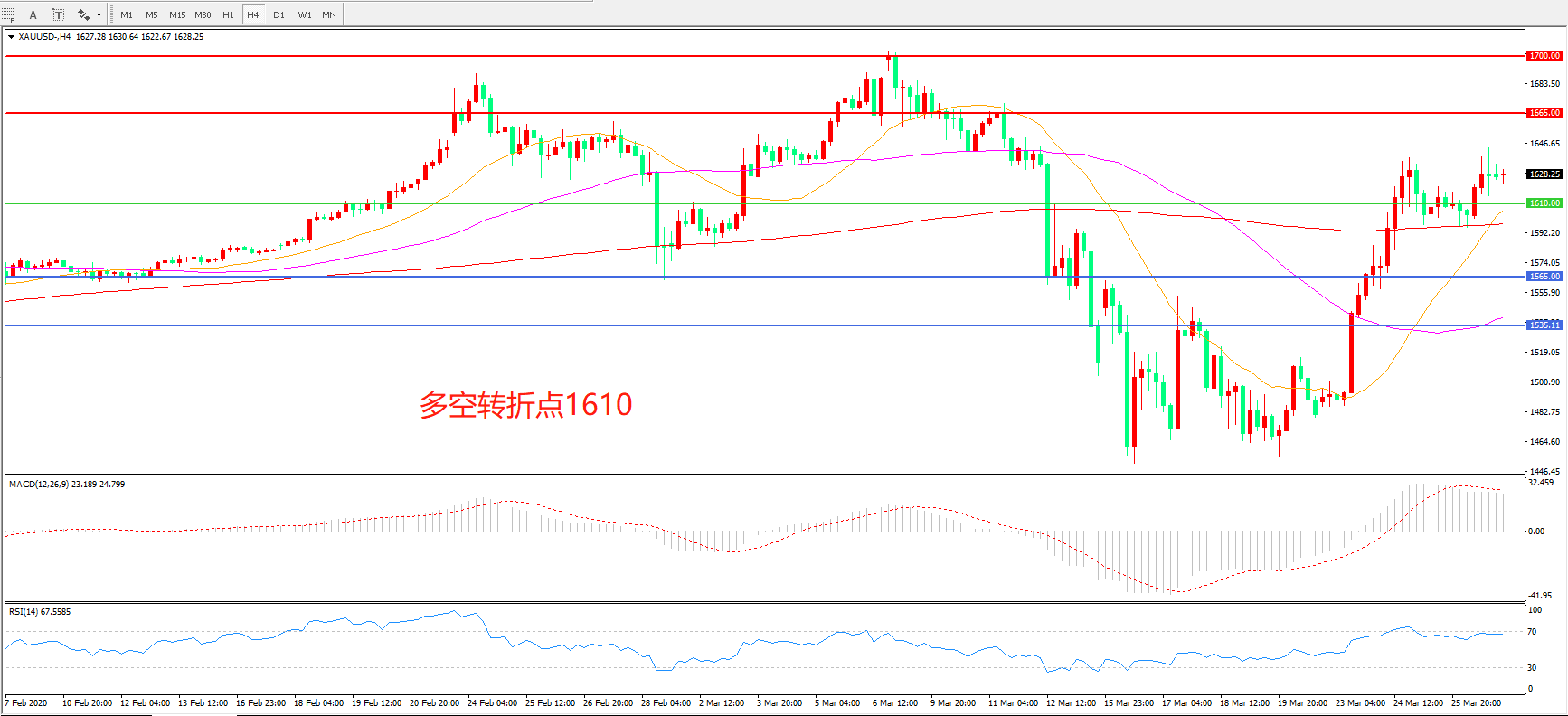 周四(3月26日),美国初请失业金人数飙升至328.3万,这是美国历史上单周失业救济人数最多的记录。受此影响,金价震荡上行,截止发稿前收报1627.87美元/盎司。美联储主席鲍威尔在首次接受媒体采访时表示,当务之急是控制住疫情,经济何时能重启取决于疫情的发展状况。