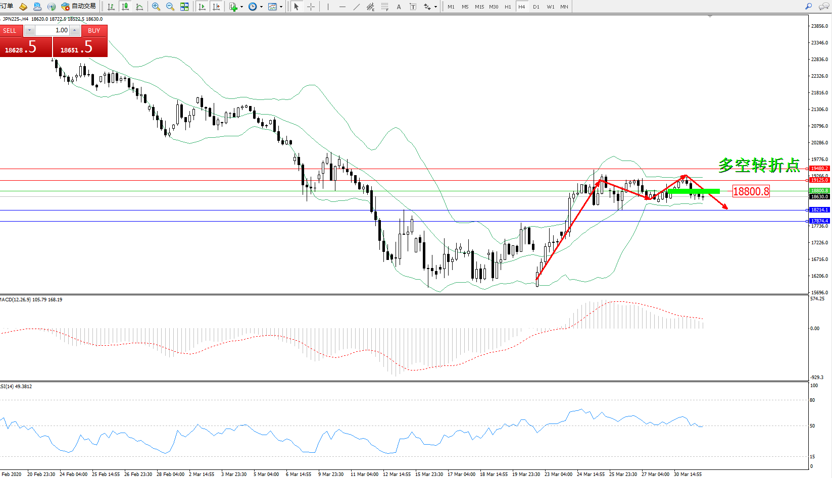 日经225指数331日(周二)收盘下跌236.97点,跌幅1.24%,报18848.00点。日内风险偏好情绪回暖,中国方面数据也向好,而美国料采取新一轮经济刺激计划,亚洲股市纷纷走高,同时日本国内新冠感染病例超过2000例,日本疫情有所恶化,日本首相安倍晋三:疫情给日本经济造成重大冲击,将会部署有力的措施来弥补经济损失,将组建额外预算以及使用其他财政资源,目标是保护就业、居民收入和企业。疫情令全球经济收缩,也给日本经济造成巨大冲击。
