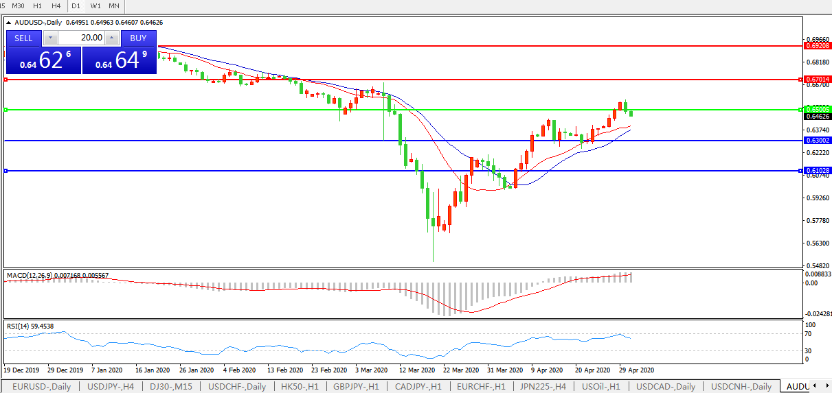 技术面简析:日图均线呈多头排列,汇价上破0.65关口后开始乏力转势下行,MACD运行于0轴上方但量能小幅缩量,RSI开始走低,预计汇价大概率将进一步下行。
